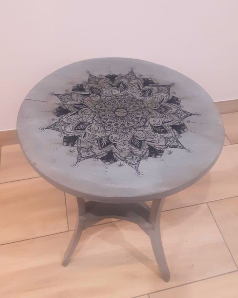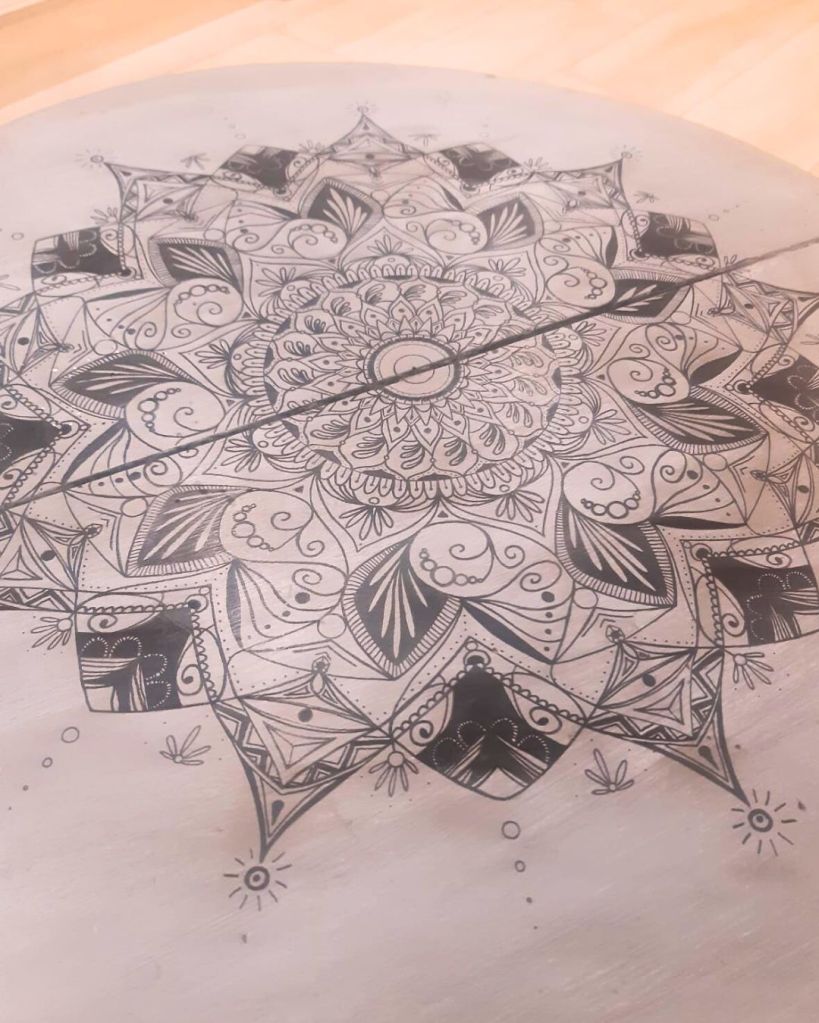 Demande de création d’un mandala sur une table en bois. Création réalisée au posca noir et plus de 10h de travail.